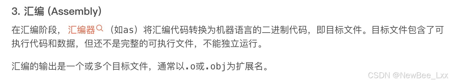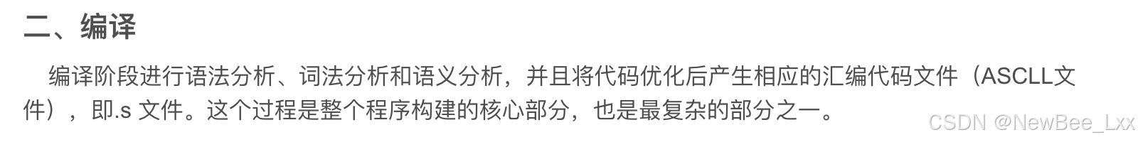 编译的输出是一个或多个汇编代码文件,通常以.s为扩展名。
