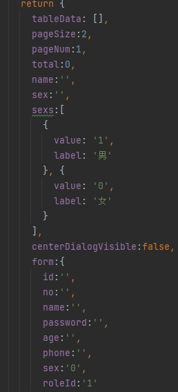 此时pagesize pagenum都是默认的 因为是管理员页面roleID默认是1 只查询roleId为1的 所以查询的都是管理员 name sex都默认是空 模糊查询就查到了所有管理员