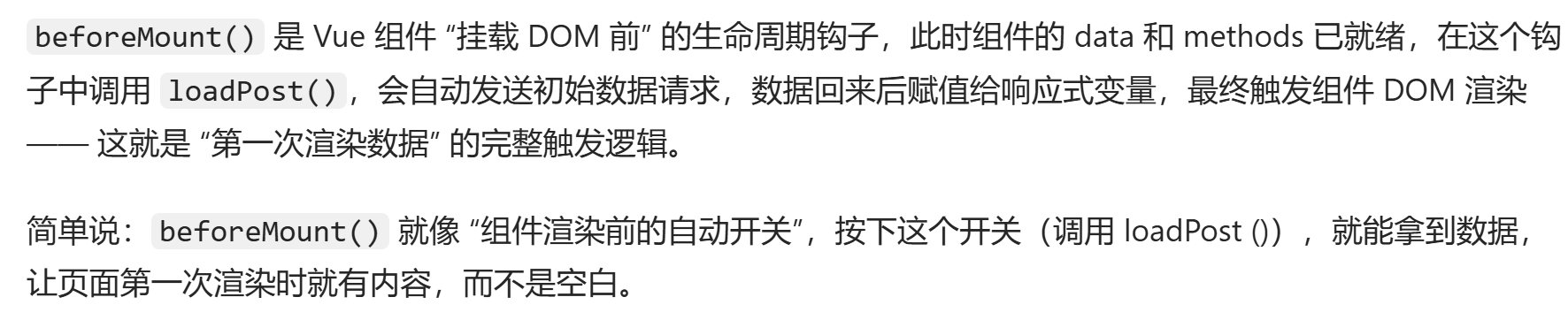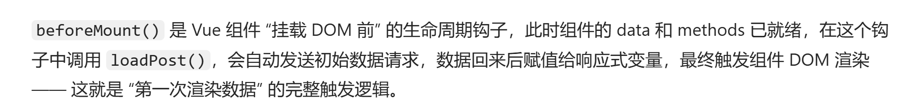 之后就自动调用beforeMount第一次渲染数据 loadpost一下