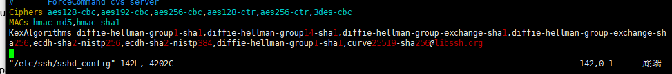 KexAlgorithms diffie-hellman-group1-sha1,diffie-hellman-group14-sha1,diffie-hellman-group-exchange-sha1,diffie-hellman-group-exchange-sha256,ecdh-sha2-nistp256,ecdh-sha2-nistp384,diffie-hellman-group1-sha1,curve25519-sha256@libssh.org