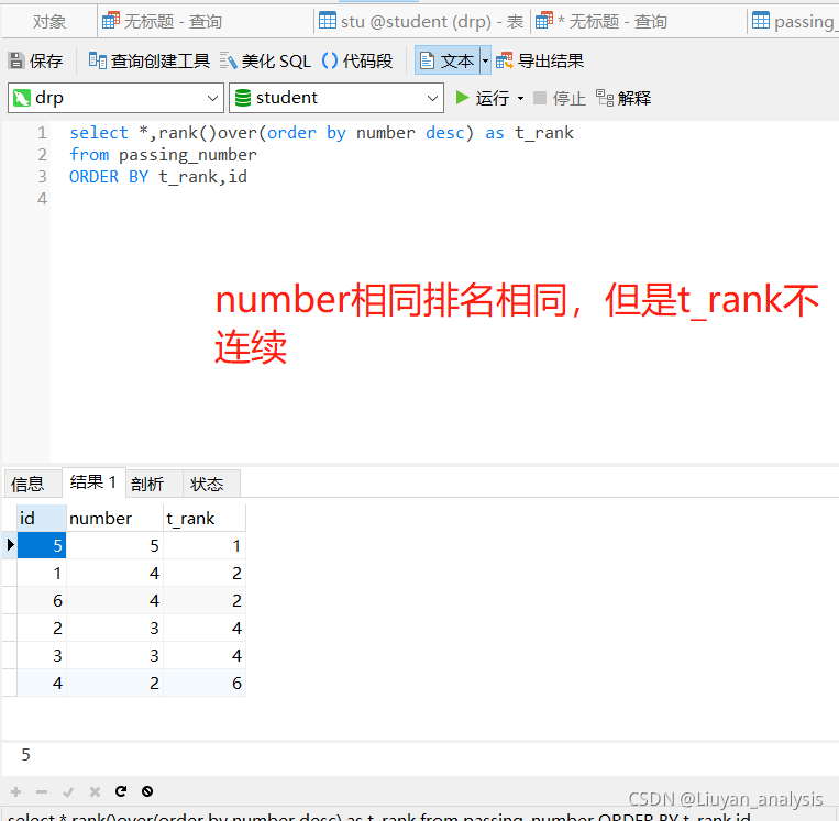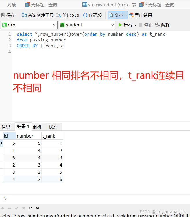 dense_rank和rank 考虑并列的情况,区别在于rank不连续,并列排名的个数会影响接下来的排名,表现为数字的中断,而dense_rank 不管有几个并列的第2名,接下来都是从3开始排。且看下面的例子:对number进行排序,number一样的通过id升序排序