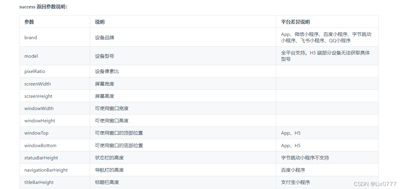 根据官方文档的讲解,里面包含很多参数,看自己的需求来获取,同时官方也是对各个平台的差异做出了说明,参数有点多,就只截图一部分,详情请转至 获取系统内容