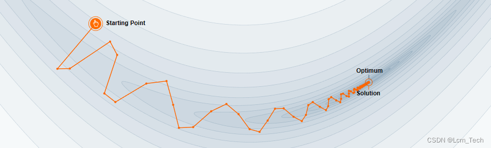 我们可以从以下两幅示意图中看到区别,第一张图没有加Momentum,第二张图加了Momentum。可以看到在第一张图中,点一开始往梯度变化的方向移动,但是到后来梯度逐渐变小,到最后变为了0,所以最终没有到达最优点。而第二张图由于加了Momentum,所以点会有一个横向移动的惯性,即使到了梯度为0的地方也能依靠惯性跳出。