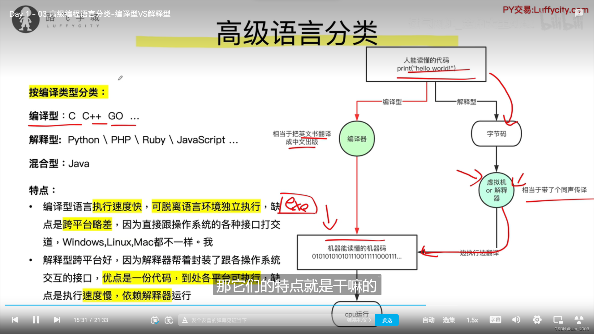 解释型跨平台好,,优点是一份代码,到处行,缺点是执行速度慢,依赖解释器运行