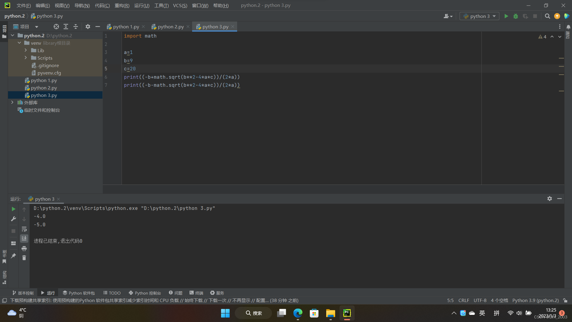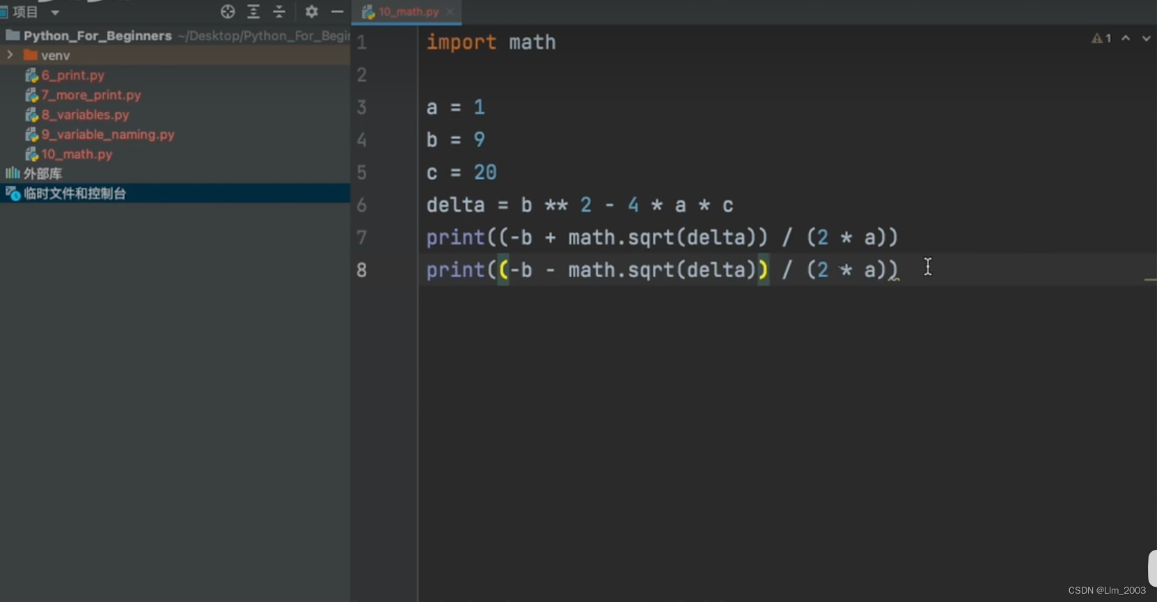 本文介绍了如何在Python中进行基本的数学运算,包括加减乘除、次方以及使用math库进行更复杂的运算。通过引入math库,可以使用内置函数如sqrt进行平方根计算。示例展示了如何编写一元二次方程的求根公式,强调了使用代码进行数学运算的好处,如方便检查公式、易于改变变量值和简化复杂运算。