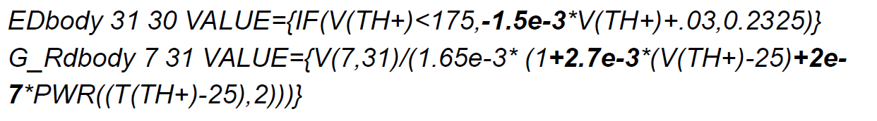 体二极管正向电压:在低电流下,正向电压用EDbody的温度系数建模。EDbody中的最后一个参数用于将Vf限制在175℃以上。G_Rdbody的热参数用于模拟高电流区域。