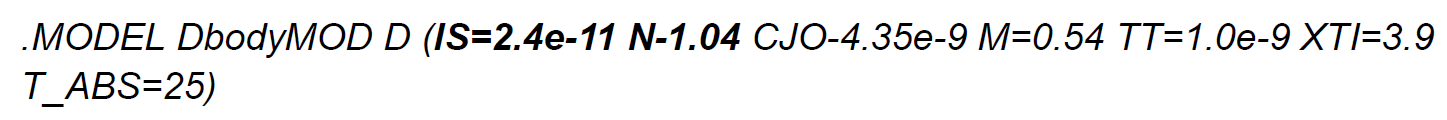 通过调整Dbody-MOD中的参数IS和N,匹配低电流下的二极管曲线数据。将正向电压绘制在对数刻度上,N将调整斜率,IS将使曲线向左或向右移动。