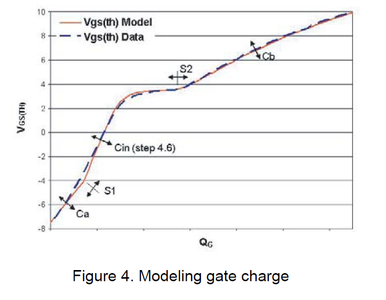 栅极电荷曲线的建模是一个四步过程(图4)。首先,通过调整Ca来调整最负栅极电压的斜率。接下来,通过调整S1A和S1B开关电压(VON和VOFF)来调整斜率断点,以考虑负电压下两个斜率之间的不连续性。S1AMOD和S1BMOD的VON和VOFF应彼此相反(S1AMOD的VON应为S1BMOD之VOFF,反之亦然)。