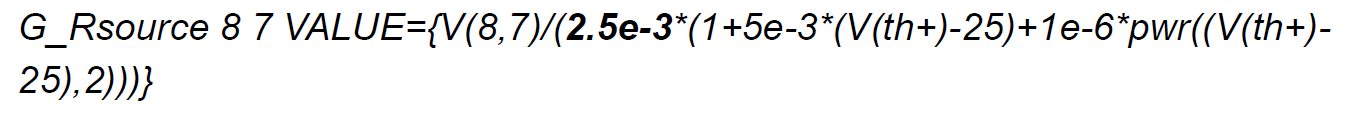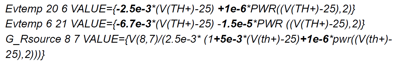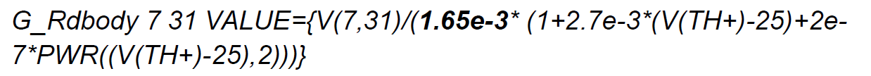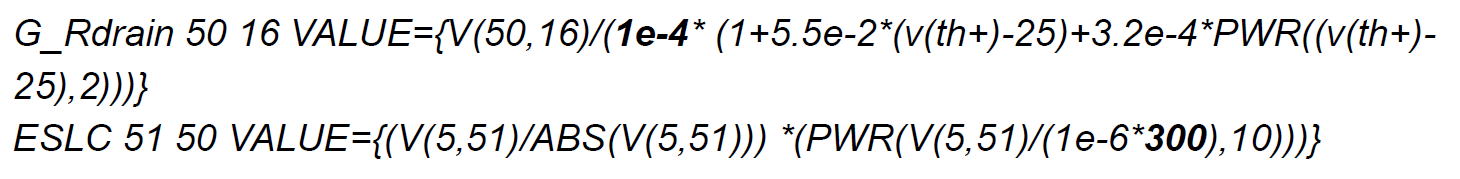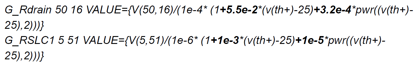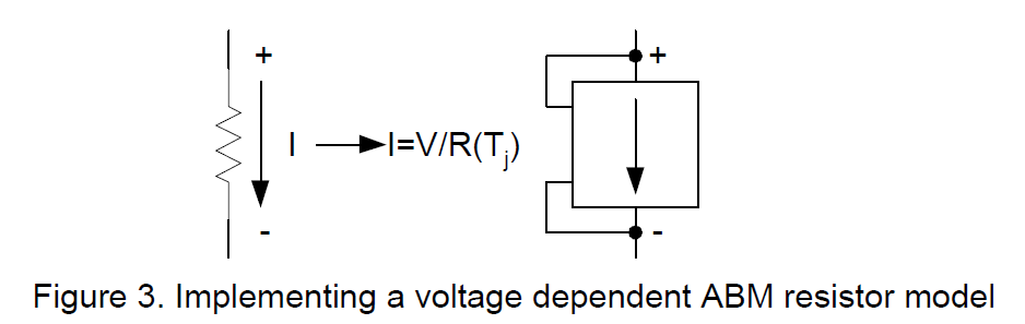 电压控制电流源ABM表达式克服了这一限制(图3)。通过使用电流源的节点进行电压控制,电阻器的行为可以表示为I=V/R(Tj)。电阻R(Tj)由依赖于结温的电压节点Tj表示的行为模型表达式代替。该电压控制电流源ABM模型用于实现RDAIN、RSOURCE和RSLC1的电压依赖表达式。