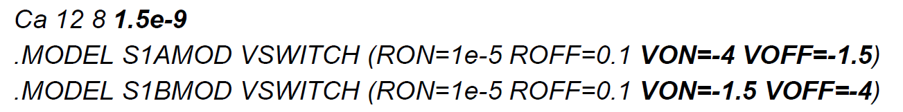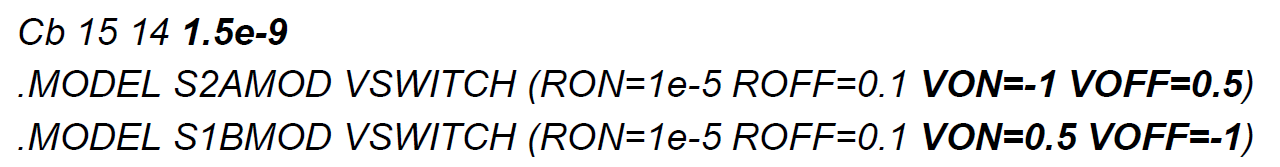 开关S1A至S2B的VON值应沿正向增加。每个VON值之间应至少有0.5V的间隔。将间距减小到0.5V以下可能会导致收敛误差。