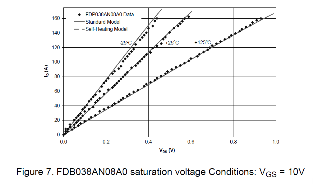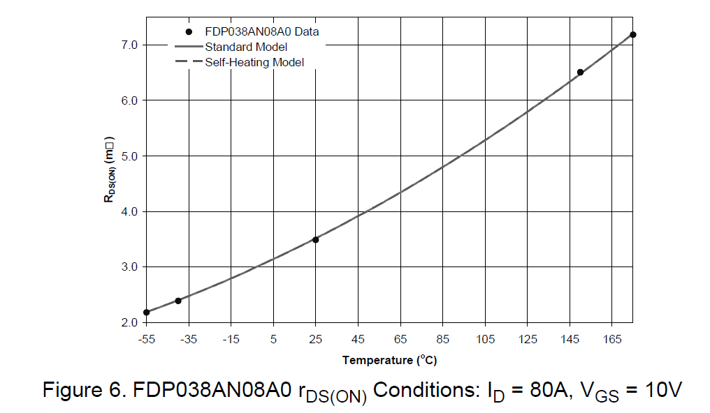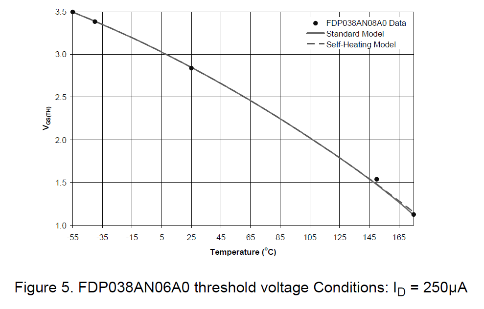 如果将之前发布的飞兆半导体MOSFET模型修改为自热模型,但完全在器件参数容差范围内,则会引入轻微的不准确性。通过在器件特定模型校准期间在1级NMOS MOSFET中包含变量T_ABS=25,可以消除这种不准确,从而使模型与新的自热模型完全兼容。该术语用于FDP038AN06A0的标准MOSFET模型校准。通过在体二极管两端添加结温依赖电流源,可以引入自热模型固有体二极管漏电流的温度依赖性。