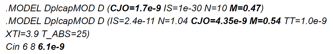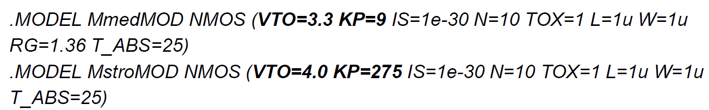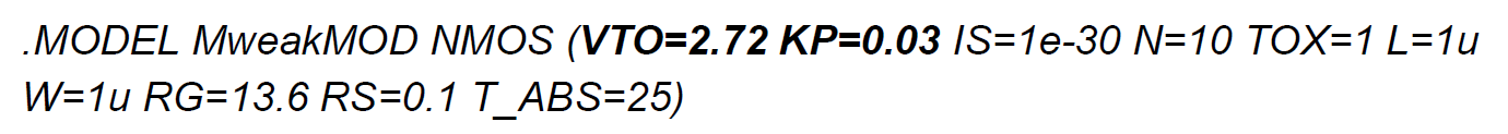 三个一级MOSFET晶体管用于对从亚阈值区域到高电流的整个电流范围的增益块进行建模。三种晶体管型号是MweakMOD、MmedMOD和MstroMOD。每个晶体管的参数VTO和KP用于将模型与测量数据对齐。