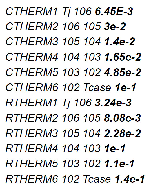 热模型独立于电模型进行建模。组件CTHERM1至CTHERM6和RTHERM1至RTHERM6用于将模拟的热阻抗曲线拟合到测量数据。为了确保良好的热模型,热电容器的值应从CTHERM1增加到CTHERM6。从RTHERM1到RTHERM6,热敏电阻的值也应增加。