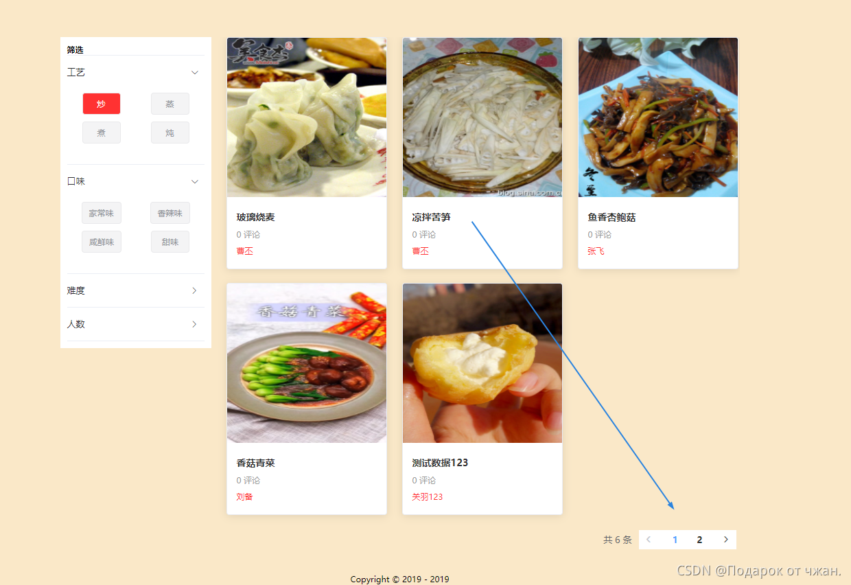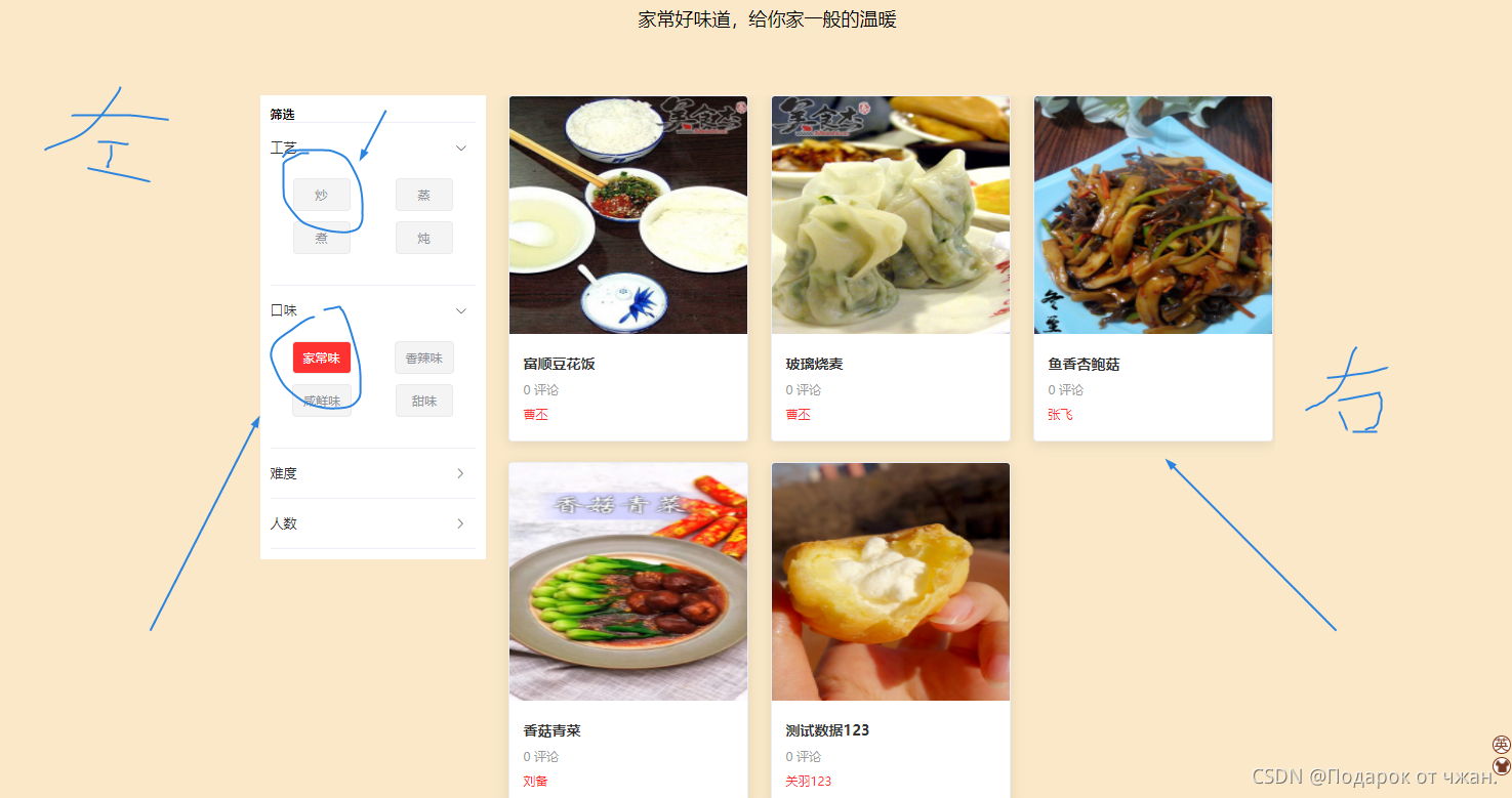 右侧是菜品展示部分,是通过左侧筛选完成之后将匹配的菜品进行展示