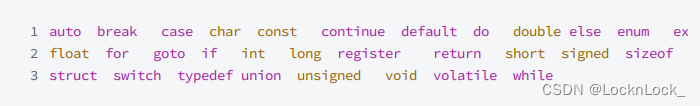 C语言中有一批保留的名字和符号,比如int、if、return等,这些符号被称为关键字。下面是一些在C语言中常见的关键字。