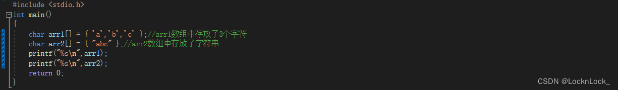 由上面的代码和运行结果可知:arr1数组中存放了3个单个的字符,arr2数组中存放了一个字符串;我们可以看到arr1数组的打印结果除了abc之外还打印了一些随机值,而arr2数组的打印结果只有abc。这是因为arr1数组中单个的字符'a','b','c'末尾没有 \0 字符作为结束标志,所以在打印完abc时,打印还没有终止。而在arr2数组中字符串abc末尾隐藏了一个 \0 字符,所以打印正常停止。需要注意的是,如果想要打印直接终止,我们可以在想要终止的字符后直接加上 \0 字符,且 \0 字符不参与字符个数的计算。从上述的例子中我们可以观察到 \0 字符的重要性。