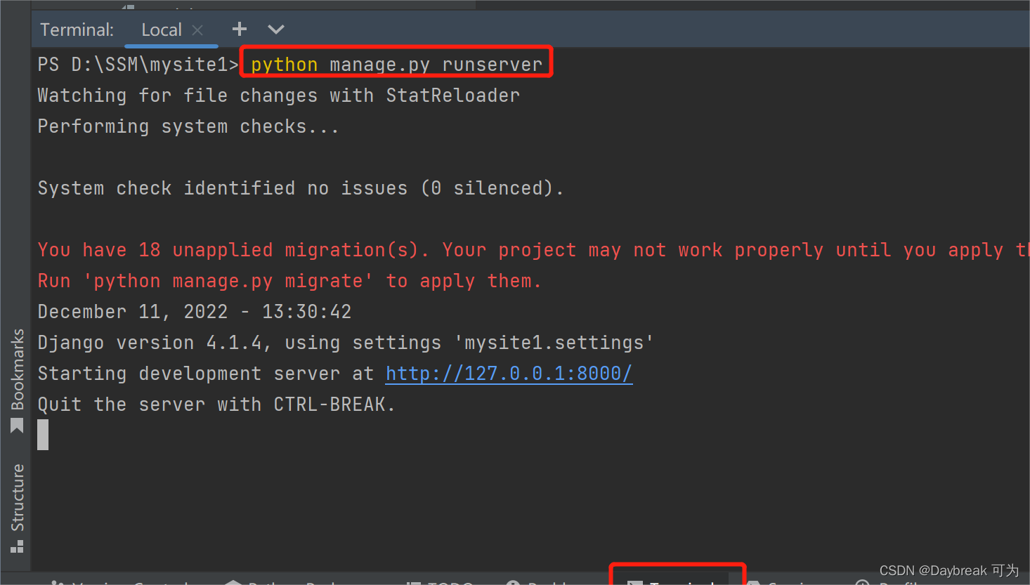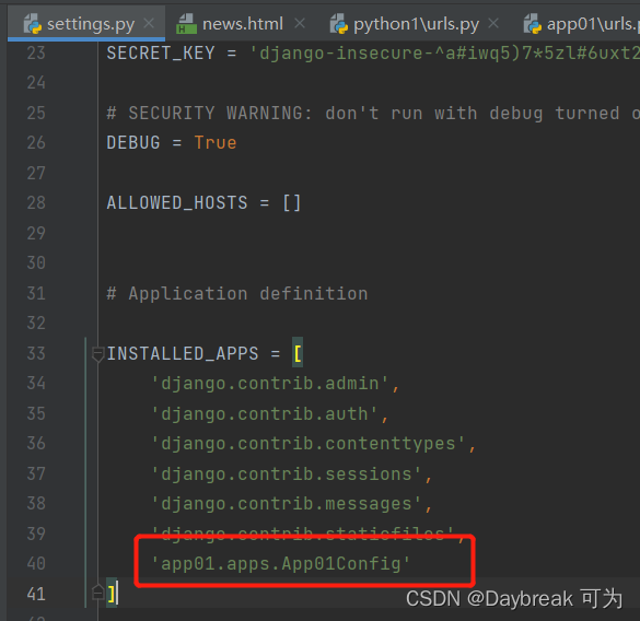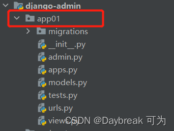 2.使用命令python manage.py startapp创建应用app01,创建完成以后查看目录app01