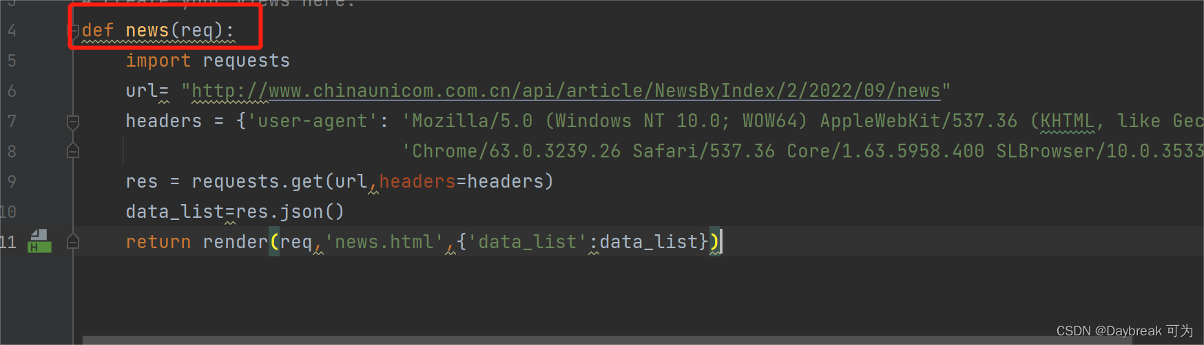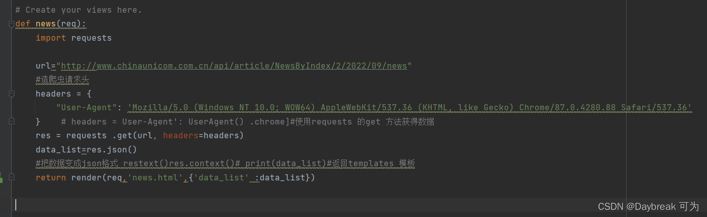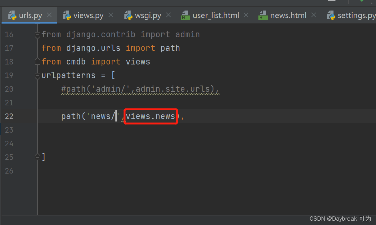 附部分代码(View.py代码、Urls.py代码和News.html代码)