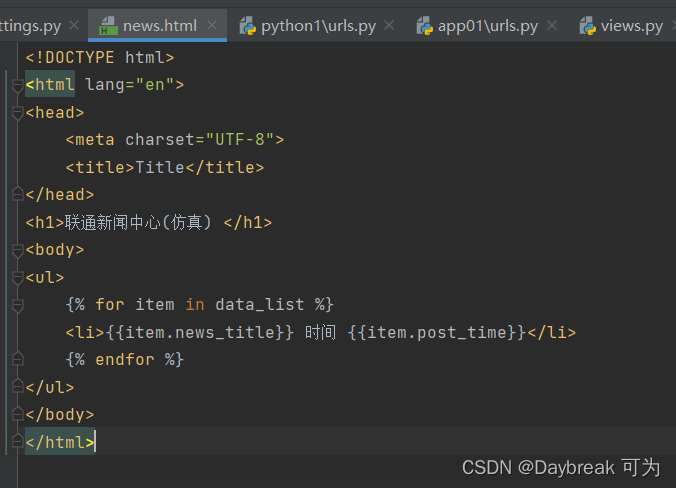 | <!DOCTYPE html> <html lang="en"> <head> <meta charset="UTF-8"> <title>Title</title> </head> <h1>联通新闻中心 (仿真)</h1> <body> <ul> {% for item in data_list %} <li>{{ item.news_title }} 时间{{ item.post_time }}</li> {% endfor %} </ul> </body> </html> |