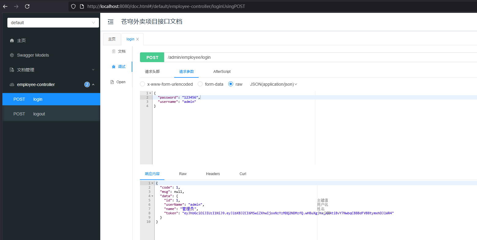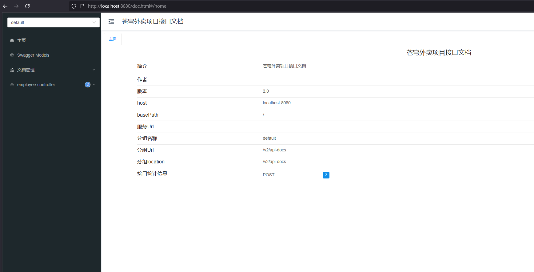 接口文档访问路径为 http://ip:port/doc.html —> http://localhost:8080/doc.html