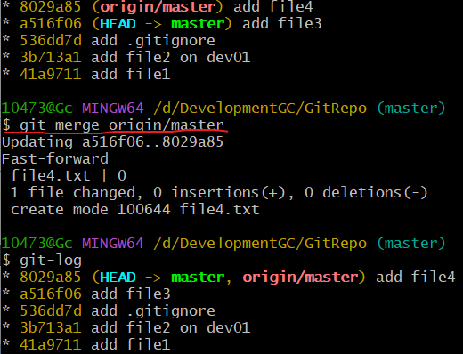 不进行合并:如图:假如别的用户向远程仓库添加了文件4,那么使用fetch后,会把文件4纳入到origin/master中,需要进行merge来整合