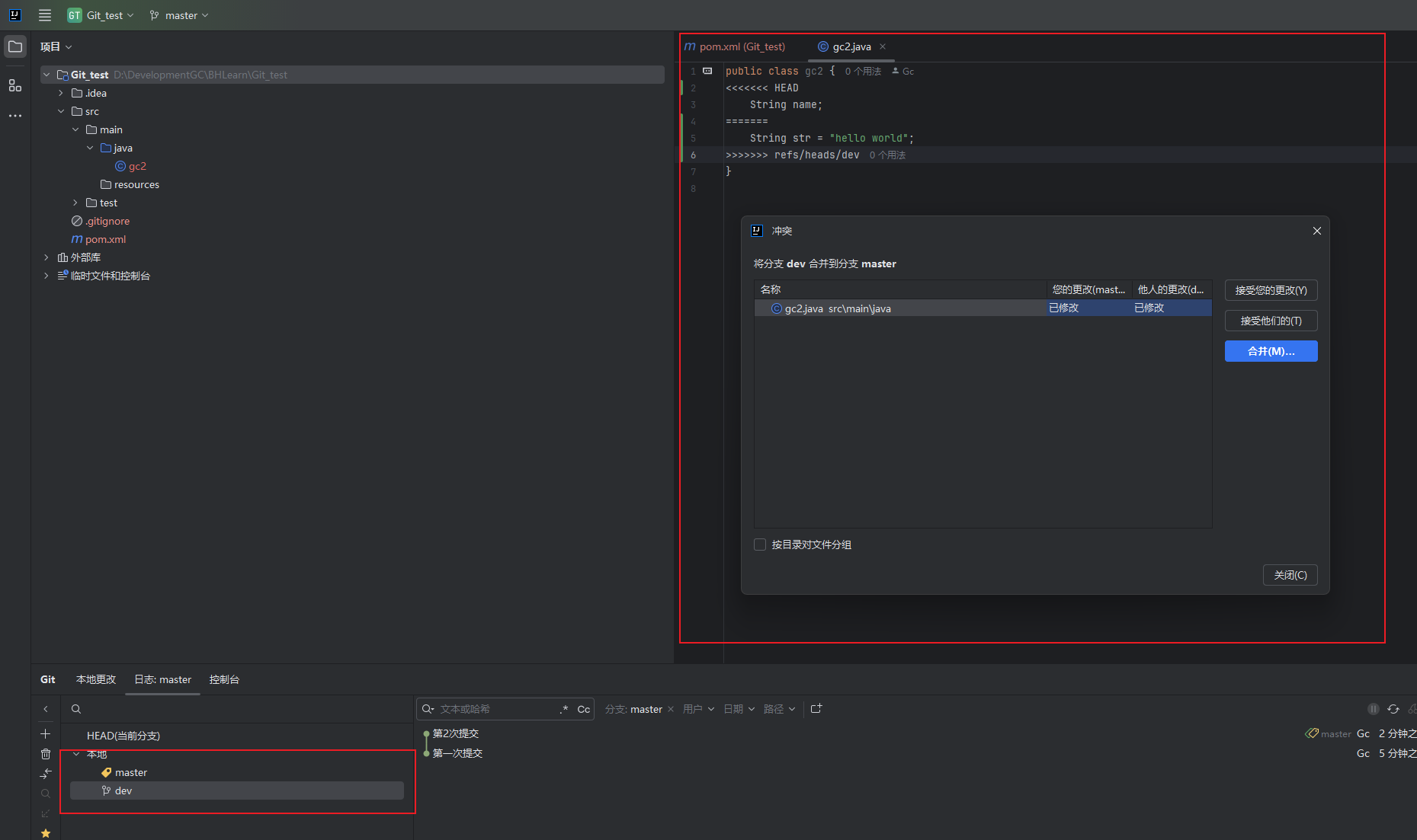 修改推送:在修改提交之后,同理发起推送,在弹出窗口中进行合并,修改代码