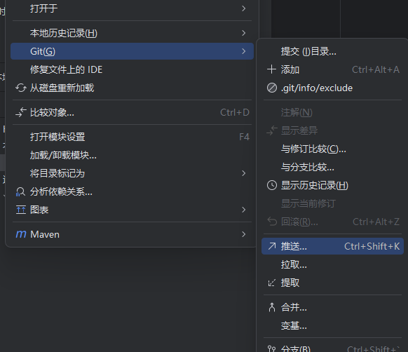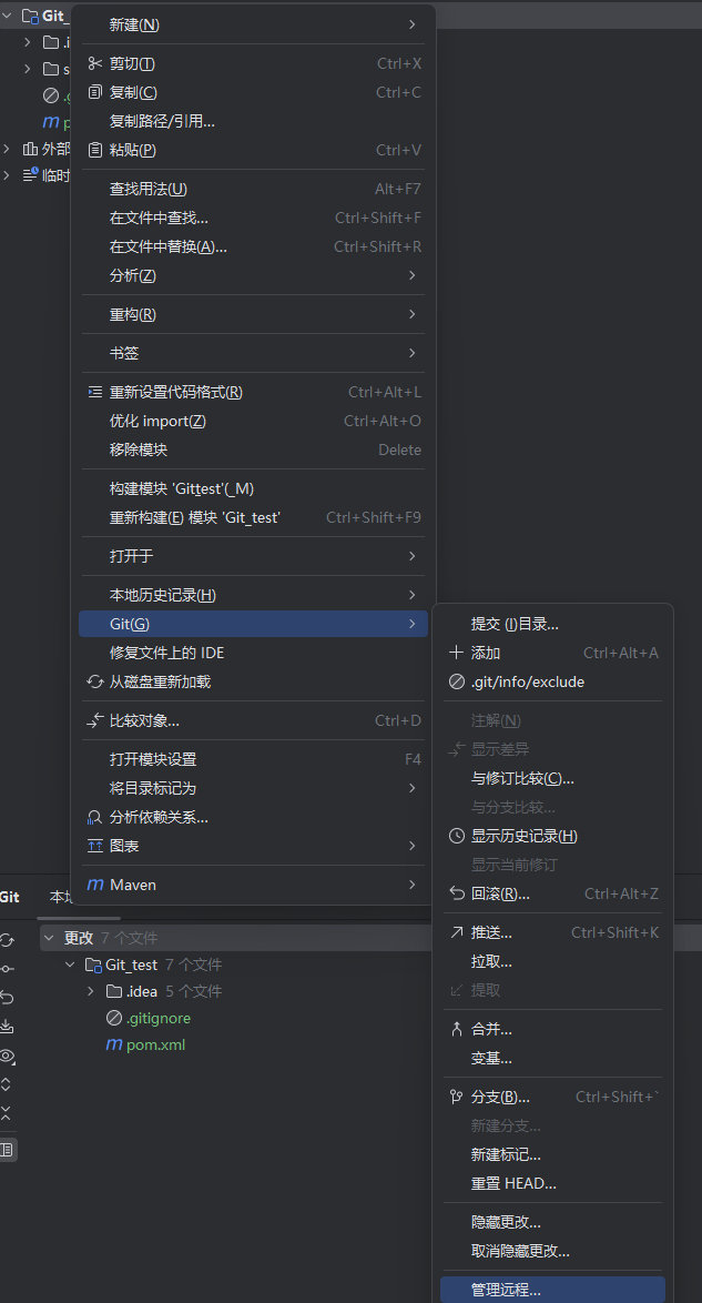 如图所示:注:建议将本地仓库放在项目文件夹里,放在其他地方会不弹出git选项(不知原因)
