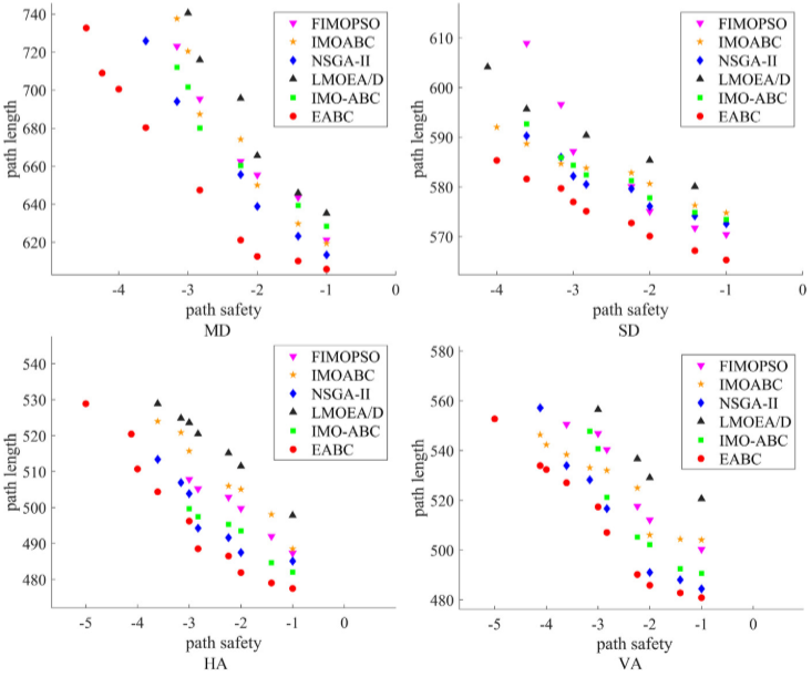 近年来,路径规划一直是移动机器人领域最受关注的问题之一。本文探讨了一个多目标路径规划问题,重点在于最小化路径长度和最大化路径安全性。基于该问题的特点,建立了数学模型,并提出了一种增强人工蜂群算法(EABC),设计了一种新的混合初始化策略,用于生成高质量的初始种群。在雇佣蜂阶段,除了交叉和变异算子外,还开发了两个面向目标的进化算子。在 旁观蜂阶段,分别对非支配个体和支配个体应用了两种自学习优化机制。基于协作的优化机制旨在提高非支配个体的质量。支配引导优化机制则引导支配个体向非支配个体学习。在侦察蜂阶段,探讨了一种新的个体重启策略,该策略考虑了全局最优解的有用信息,从而提高了算法的探索能力。