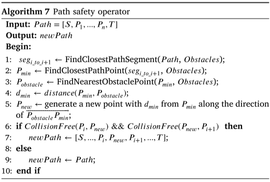 路径安全算子提升路径安全性,减少与障碍物的碰撞风险。与大多数研究不同,本文基于路径与障碍物的最小距离来衡量路径安全性。该算子通过选择路径段中与障碍物最接近的点,并努力改善该路径段的轨迹,以尽可能避开障碍物。