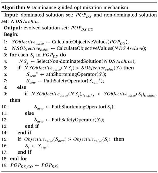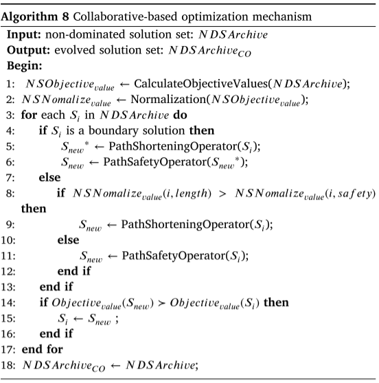 非支配个体的特性有助于引导进化算法选择合适的局部搜索算子,有效地探索目标空间并改进目标值。为了提高非支配解对算法收敛性的正向影响,研究提出了基于协作优化机制。非支配解被进一步划分为边界解和非边界解,其中边界解指在某个目标上达到最优值的路径,如最佳路径长度或路径安全性。其余非支配解被视为非边界个体。
