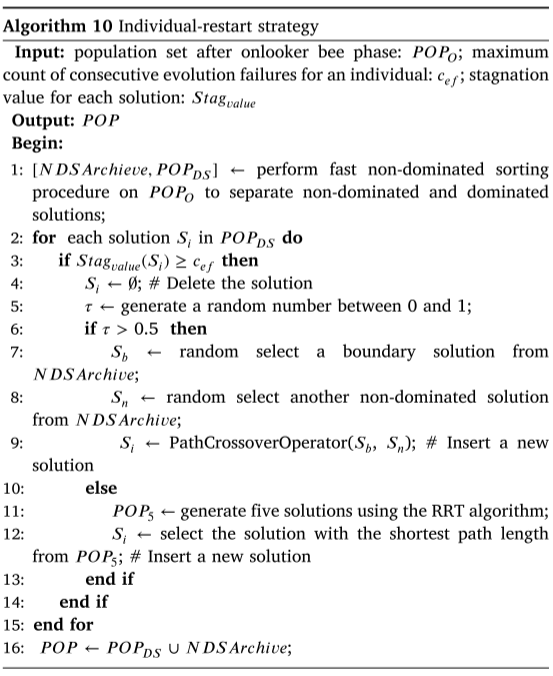 侦察蜂阶段通过替换停滞的进化解来维持种群质量。为了识别停滞解,统计每个解的连续进化失败次数。本文提出了一种个体重启策略利用最优解的有用信息生成新解,该策略不仅继承帕累托前沿的优良特征,还保持种群的多样性,避免解的过度收敛。