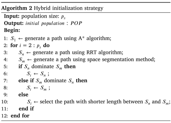 混合初始化策略旨在提高初始种群的质量。在本文中,初始种群通过三种经典的路径规划方法生成:A* 算法、RRT算法和空间分割方法。A* 算法用于生成优化路径长度的解;空间分割方法通过等间隔的垂直线划分起点和目标点之间的空间,随机选择点并连接形成路径;RRT算法则通过从起点扩展树结构,探索高维空间以生成覆盖尽可能多解空间的路径。利用这三种方法,初始种群可以包含不同类型的路径(如线覆盖、区域覆盖和表面覆盖),从而增强种群的多样性。通过结合这三种方法的优势,生成了一个多样化且高质量的初始种群。