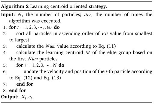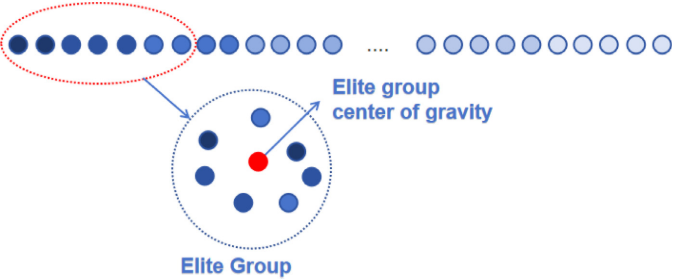 为避免传统 PSO 中个体或群体陷入局部最优导致全局停滞,本文提出质心牵引策略,通过适应度排序形成精英群体,并计算其平均位置作为学习质心,粒子在更新过程中同时参考个体最优、群体最优与质心信息。该方法减少了因单个精英误导带来的风险,提升了群体协同与信息利用效率,加快收敛并降低陷入局部最优的概率。