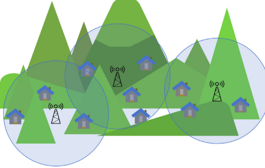 山区三维地形模型以等高线图呈现空间特征,村庄被划分为多个信号需求单元点,包括住宅区、工业区和聚集性需求区。信号覆盖范围限定在地表至高度 H G HG HG的区域,山体以下和极高区域均视为无需求区。该模型结合地形与村落分布,能够有效模拟山区复杂环境下的基站覆盖需求。