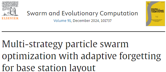 [1] Zhu D, Shen J, Zhang Y, et al. Multi-strategy particle swarm optimization with adaptive forgetting for base station layout[J]. Swarm and Evolutionary Computation, 2024, 91: 101737.