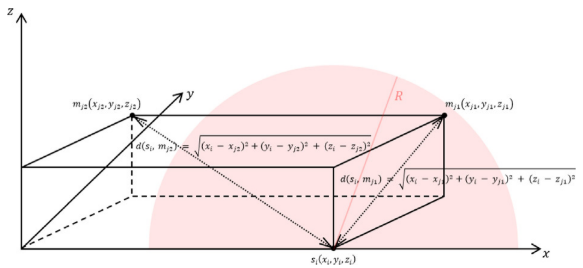 d(s_i,m_j)=\sqrt{(x_i-x_j)^2+(y_i-y_j)^2+(z_i-z_j)^2}