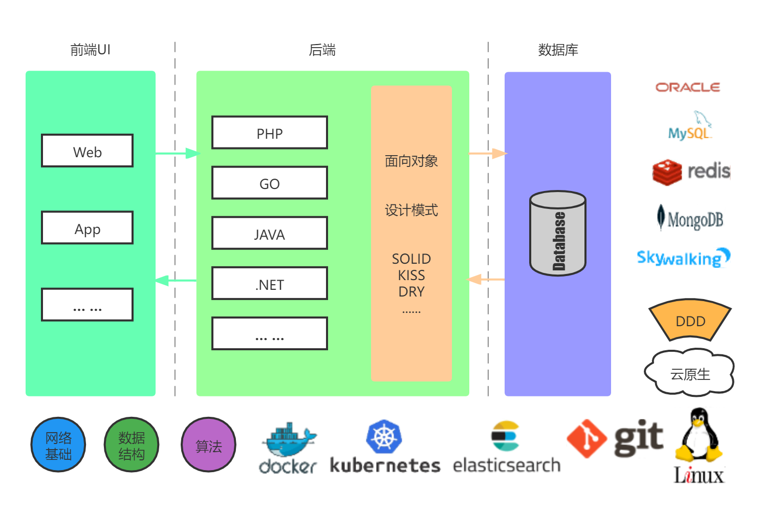 其实反过来说,这样的条件下,换一门语言也很容易。因为通过这样的图也可以看到,在目前新技术越来越多的情况下,需要变化的只是复杂的技术版图中的一个小方块。从PHP、Java、.NET这些语言互换,如果只是做后端API,大部分“技术版图”都是不变的。网络、数据结构及算法是基础,数据库、Git、docker、k8s这些又都是支持多种语言的,完全都是通用的。