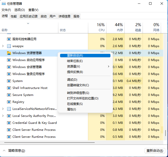 按下ctrl+shift+esc打开任务管理器,找到Windows资源管理器,也就是explorer.exe