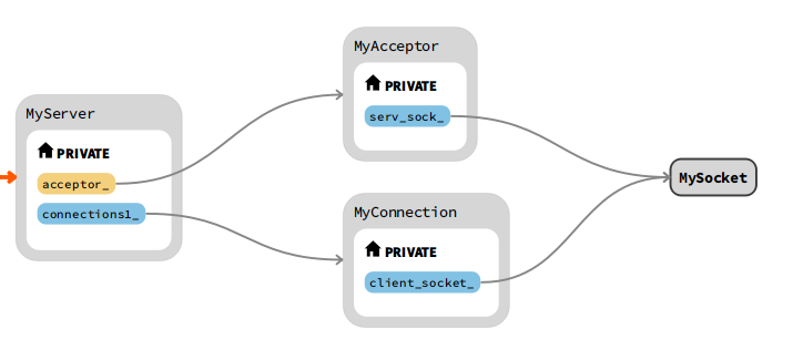 在最初版本中,MyConnection中使用fd裸指针作为成员函数,其逻辑就会散落在 Connection 或调用者中,耦合度高,不利于维护。而使用 MySocket 作为封装,可以带来明显好处: