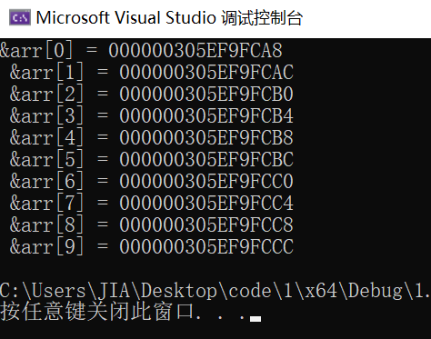 从输出的结果我们分析,数组随着下标的增长,地址是由小到大变化的,并且我们发现每两个相邻的 元素之间相差4(因为⼀个整型是4个字节)。所以我们得出结论:数组在内存中是连续存放的。这就 为后期我们使用指针访问数组奠定了基础。