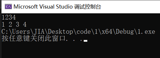 注意:此时结果4并未直接输出,否则代码运行结果为4 3 2 1,而是先将经过函数拆解后的n=123带入函数中进行下一步运算,先调用函数直至n不符合调用函数的时候,再输出最后的结果。