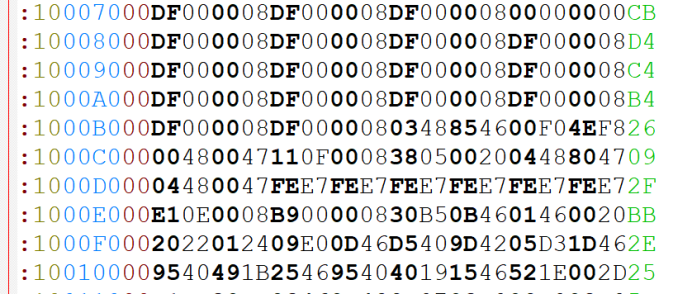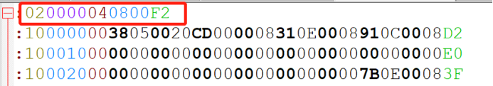 第一字节表示该行的数据字节数;如第1行只有 0x08 0x00 两个字节的数据,类型是 04 ,即该行记录的是一个拓展地址(0x08 0x00 是地址信息,用法是将该地址(0x0800<<16) 后作为基地址。并且表示在下一个04类型行出现之前都要使用该地址。