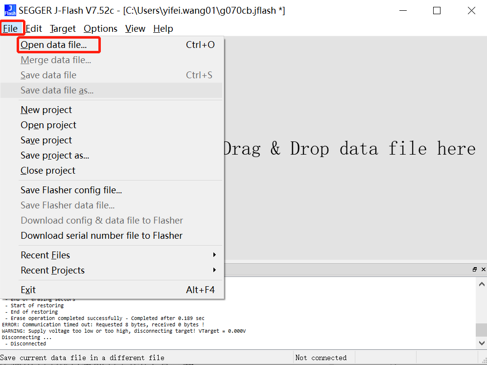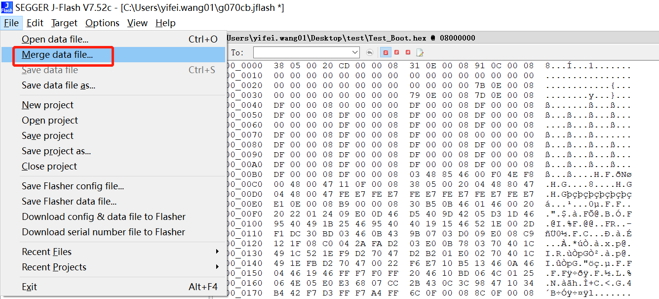 打开jflash,首先选择我们的第一个文件,file->open data file即可