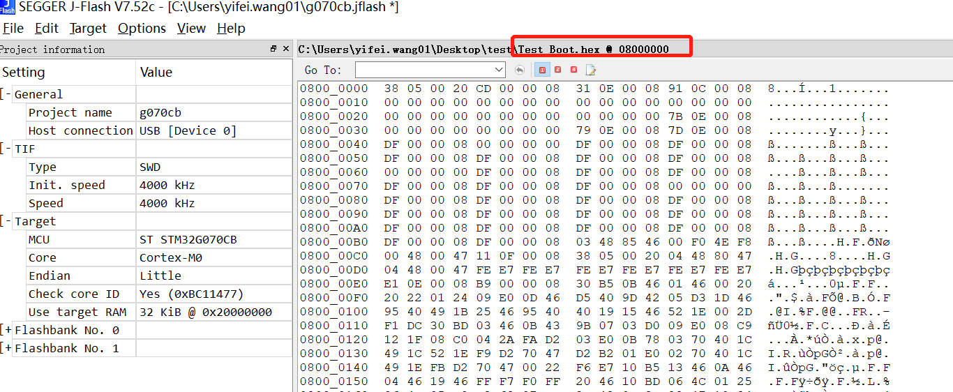 打开之后,可以看到地址是从8000000开始的,也即是我们的MCU flash的基地址