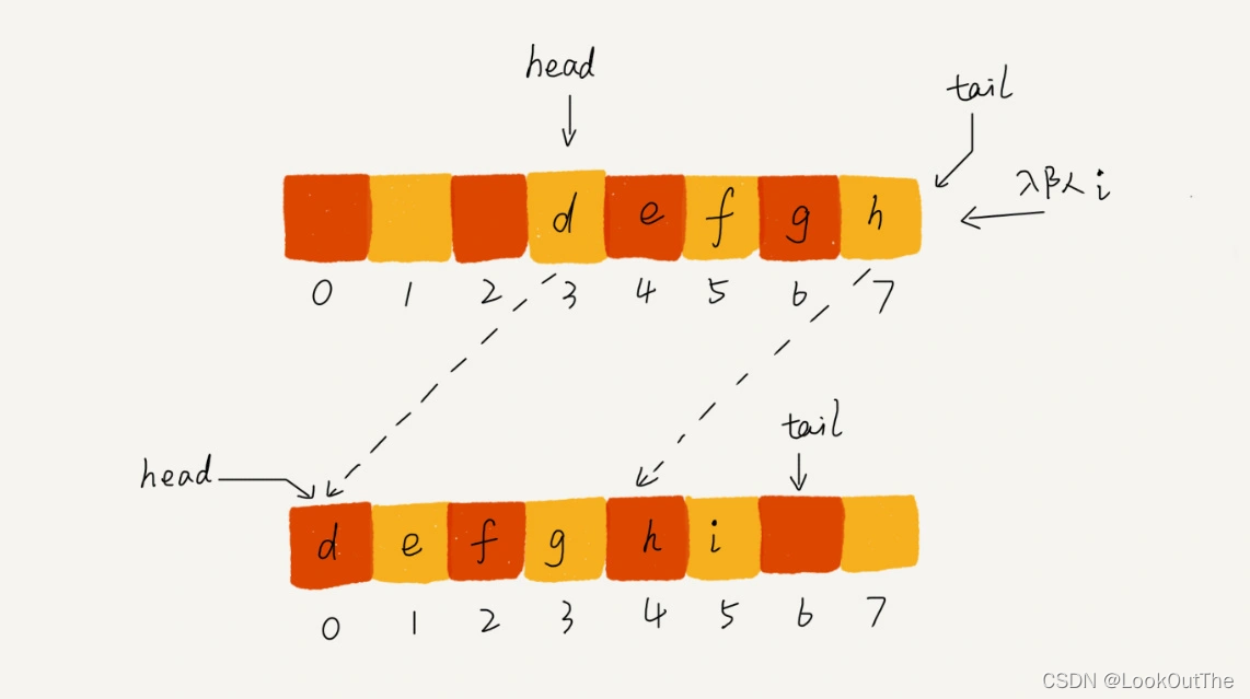 这个实现中,一共有2个变量,用来标记数据的头和尾。当数组满后,无法入队。当数组后半部分满了之后,我们入队的时候,需要将数据移动到数组的左边,然后重新修改head和tail。使得数组可以继续入队。