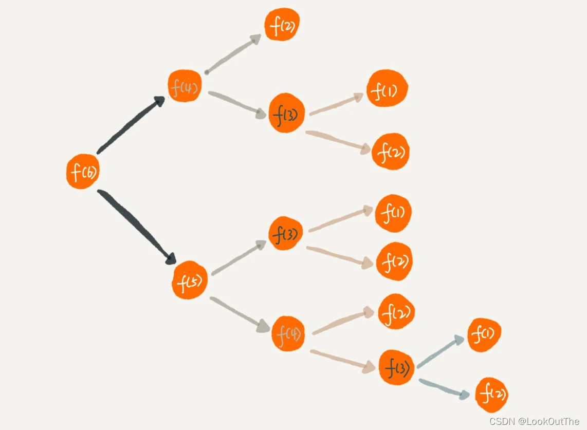 之前的代码中,如上图,我们要计算f(6)就得先计算f(5)和f(4)。计算f(5)的时候还得再计算一次f(4)。有很多重复运算。