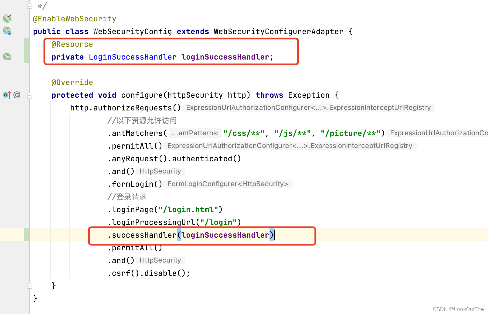 HttpSecurity被设计为链式调用,在执行每个 方法后,都会返回一个预期的上下文,便于连续调用。我们不需要关心每个方法究竟返回了什么、如何进行下一个配置等细节。