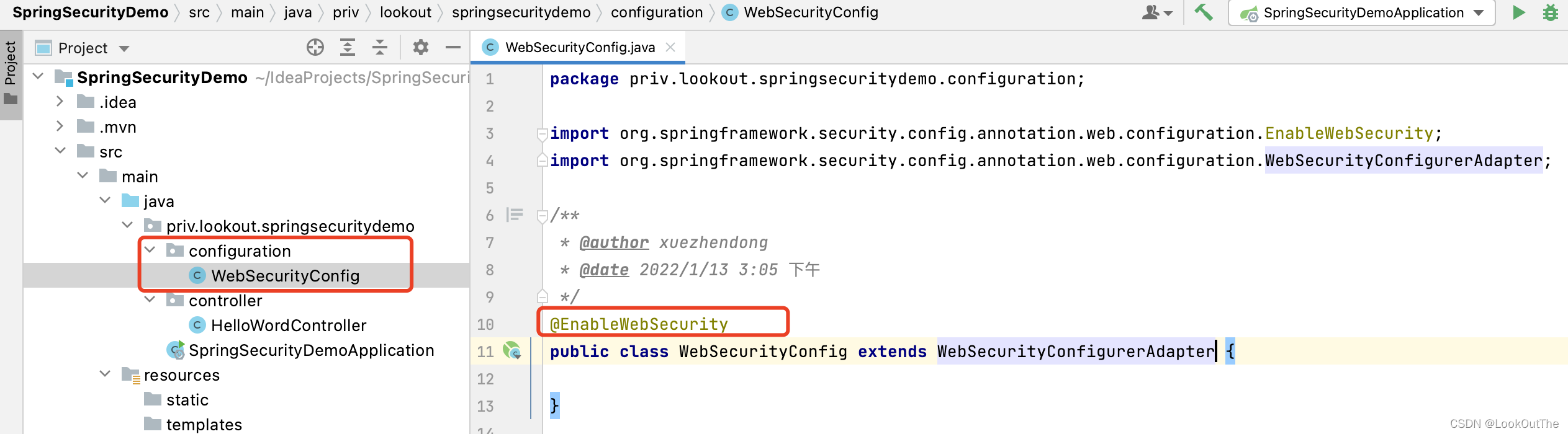1.创建configuration包,新建一个WebSecurityConfig类,使其继承WebSecurityConfigurerAdapter