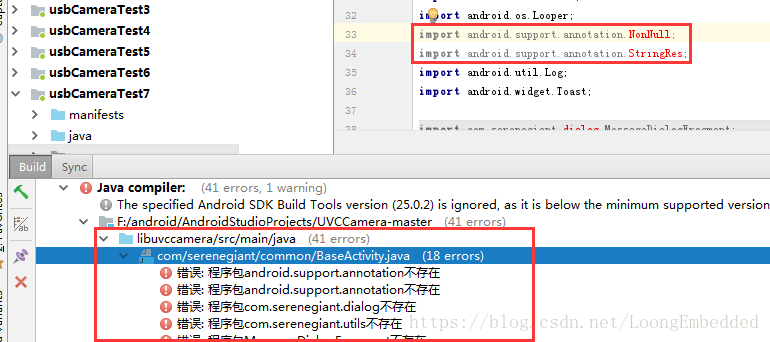需要重新把libuvccamera\build.gradle下的dependencies拷贝过去,同时我把compile "com.android.support:support-annotations:${supportLibVersion}",改为compile "com.android.support:support-annotations:27.1.1",默认的supportLibVersion是25.3.1。
