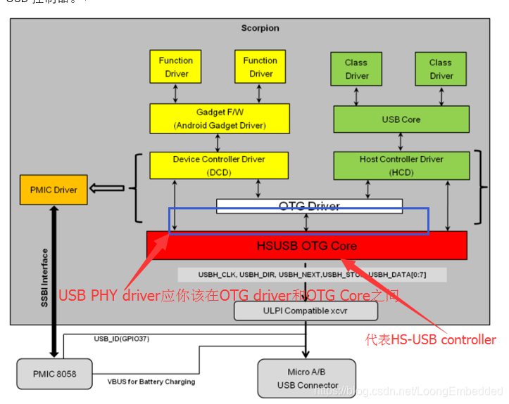 对应kernel\msm-3.18\drivers\usb\phy文件夹的源代码。USB PHY driver应该在OTG driver和OTG core之间,第1张图我有备注,下面这种图可以体现出来